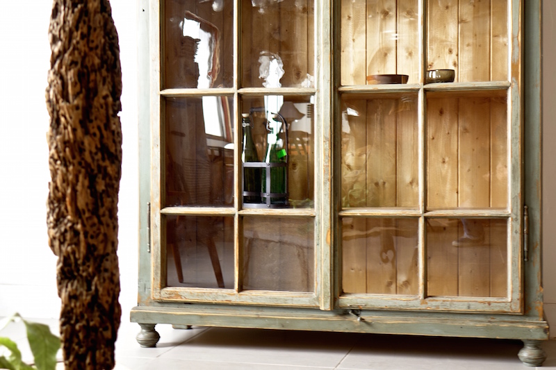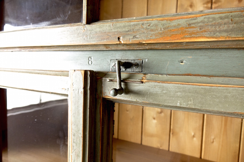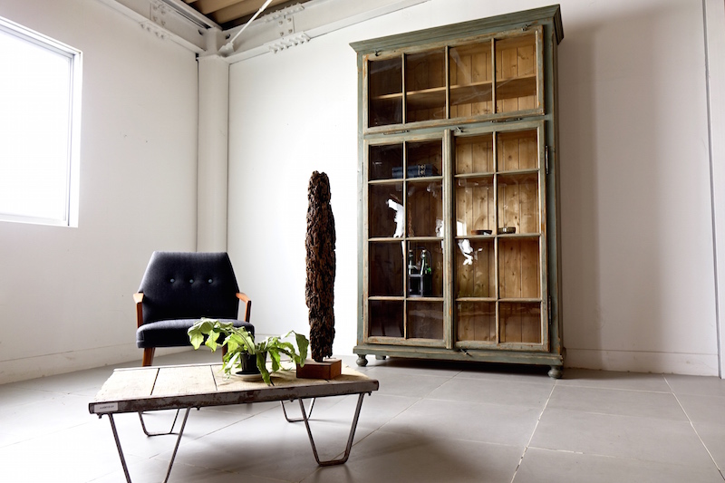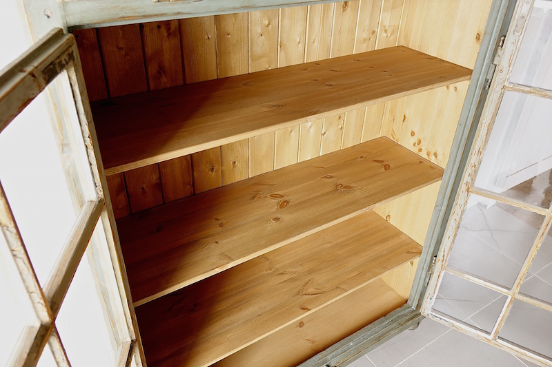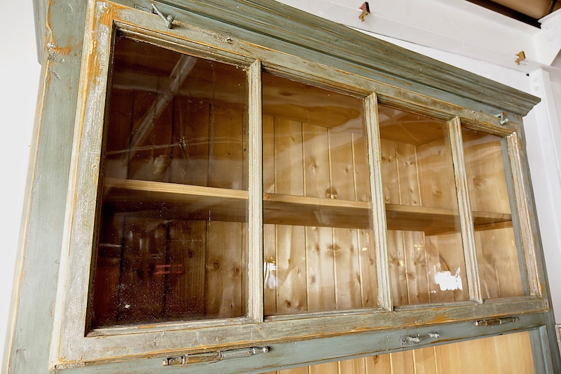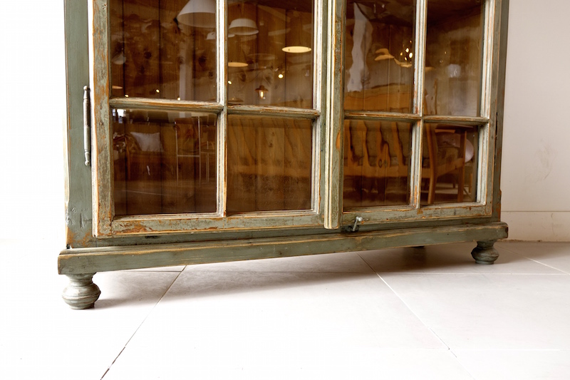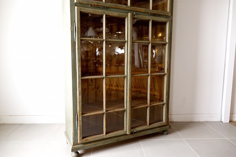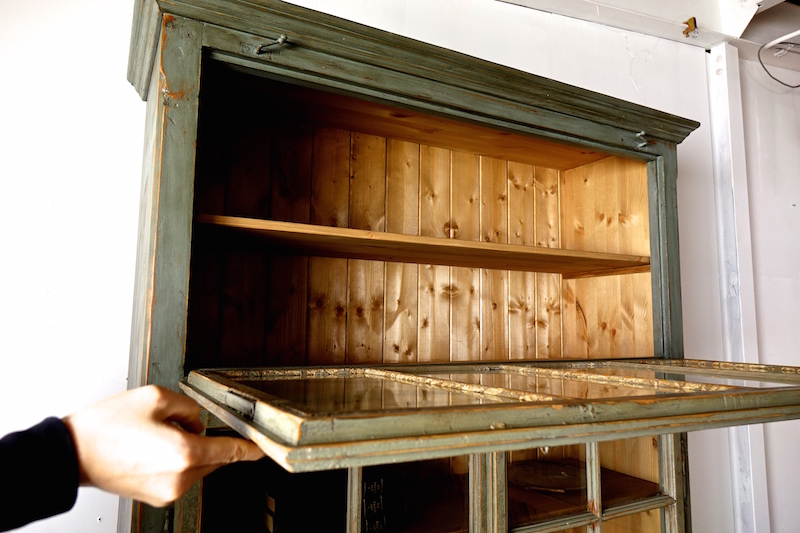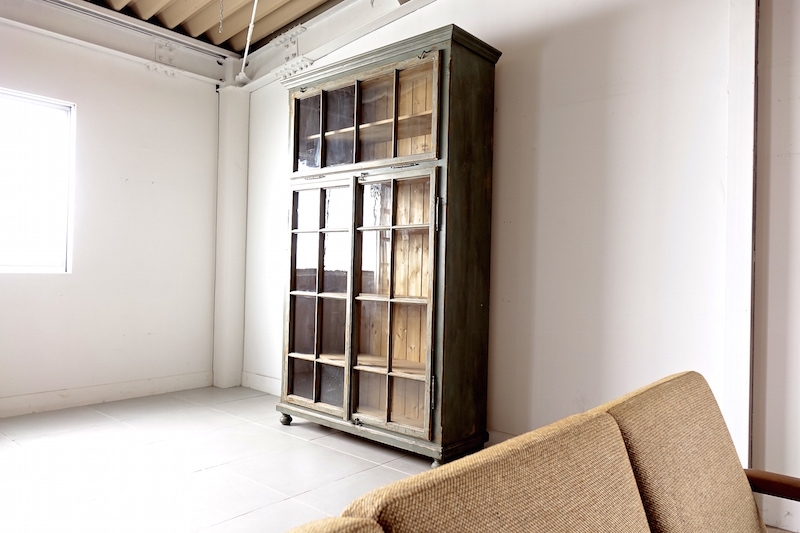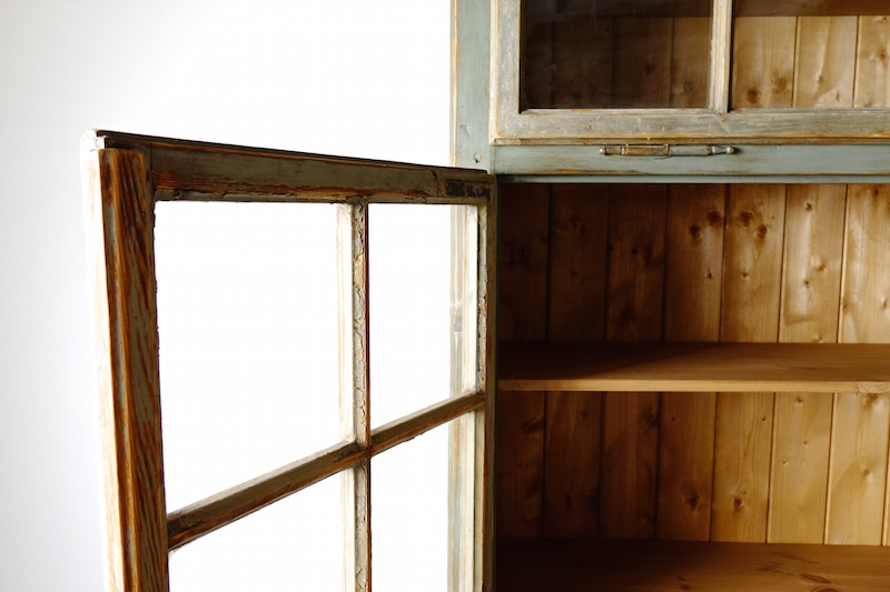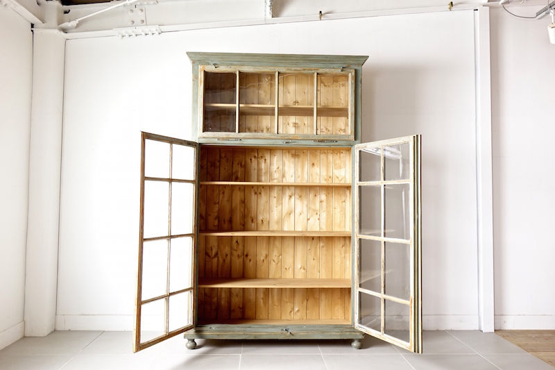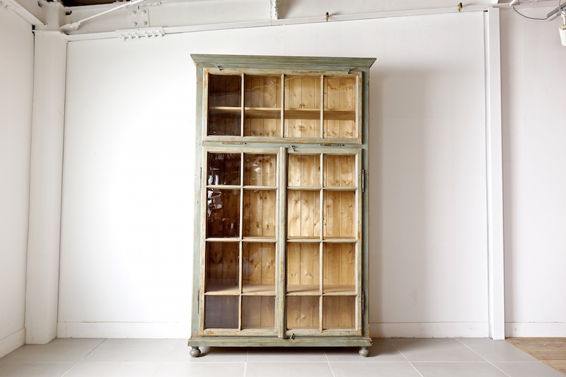 巨大なインパクトと経年のヴィンテージの風合いが漂うヨーロッパのアンティークキャビネット。 観音開きの扉を開けると三段の棚板、上段は上から下に開く少し変わったデザインをしております。 ショップのディスプレイ収納としては抜群の収納力機能性を持ち、空間を決定的に印象付ける役割を担います。