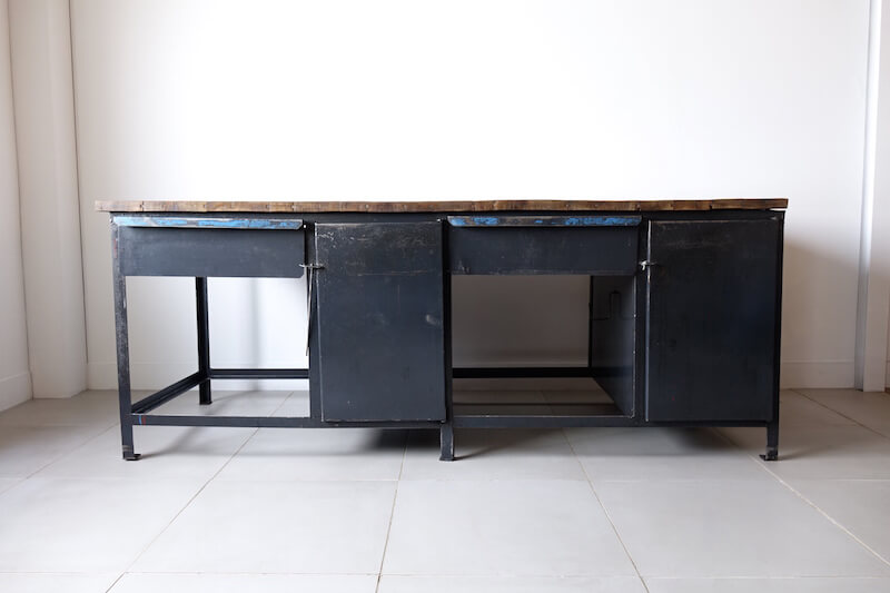 経年変化の表情が素晴らしいオランダのヴィンテージインダストリアルキャビネット。大型でインダストリアルな雰囲気が印象的で、収納力もあり、様々な空間のメインテーブルとして、またショップカウンターとしてディスプレイを引き立てる象徴的な存在になります。