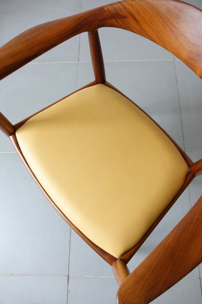 今は無きJOHANNES HANSEN(ヨハネス・ハンセン)より1949年に発表されたラウンドチェアJH503 “ザ・チェア”。1960年、アメリカ大統領ジョン・F・ケネディとリチャード・ニクソンのCBSテレビ討論会で使われたことで世界的に有名になり、現在でも名工PP MOBLERによって生産が受け続けられている不朽の名作。背から肘へかけての美しい笠木は、当時画期的であった木材同士をフィンガージョイントと呼ばれる工法で組み合わせ、見せるジョイントとしてその後の家具デザインに大きく影響を与えたと言われています。ウェグナーの作品の中でも全体的なフォルムの美しさ、座り心地、貫を使わない脚部などあらゆる点において完成度が高く、The Chair(椅子の中の椅子)と呼ばれる優れたデザインと座り心地をお愉しみいただけます。経年変化したアフロチークの美しい木目と座面に採用したキャメルレザーが品格ある雰囲気に仕上がり、ヴィンテージながらのヨハネス・ハンセンオリジナルモデルをご堪能ください。