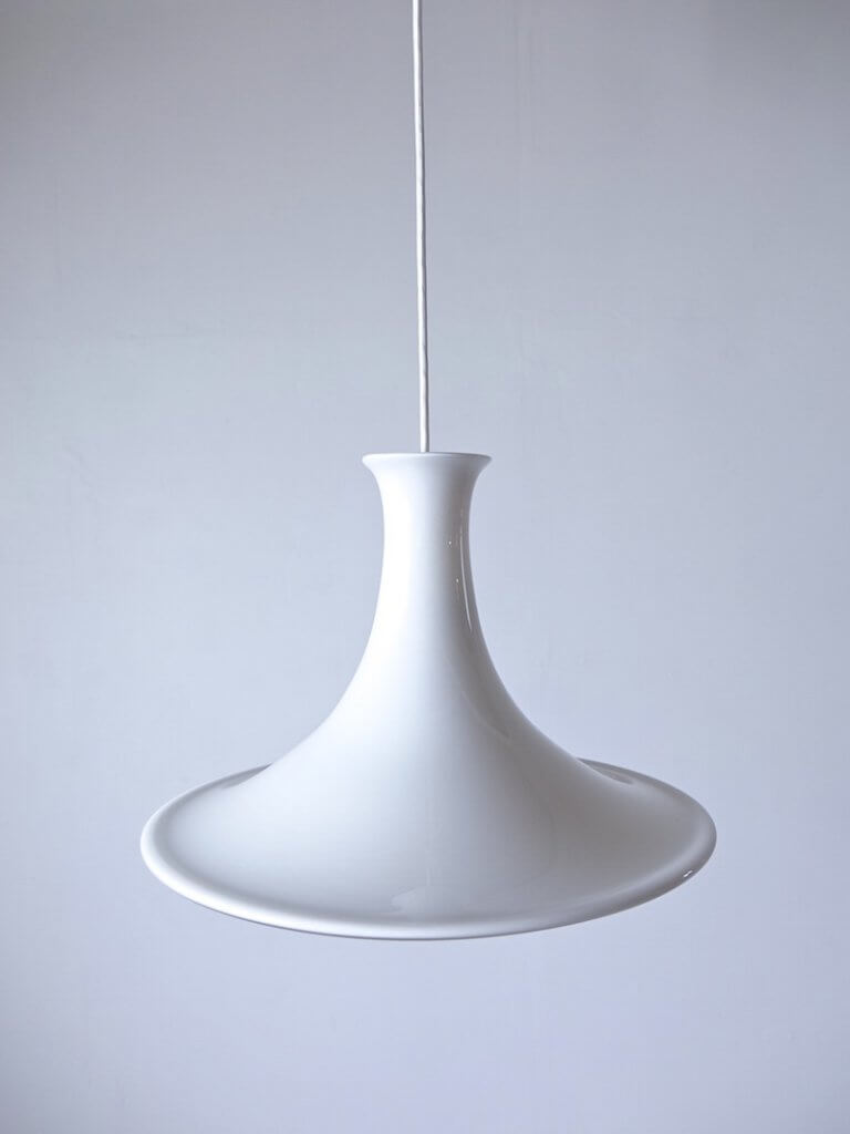 1825年創業のデンマーク老舗ガラスメーカーHolmegaard(ホルムガード)製、同社のデザイナーMichael Bangによって83年にデザインされたヴィンテージペンダント”Mandarin”。このトランペットの先端のような美しい形状は、乳白色のガラス上にクリアガラスを重ねて熔着する技法で作られ、上方へ拡散される光は独特な柔らかさを持ち、下方へは均等に機能的に光が拡散されます。点灯していない時の雰囲気もエレガントで、贅沢な空間の組み合わせと豊かな時間をこの照明は提供してくれそうです。(ソケットは引っ掛けシーリングタイプ、対応電球はLEDを含むE26口金サイズ。)