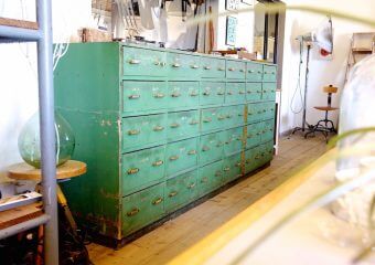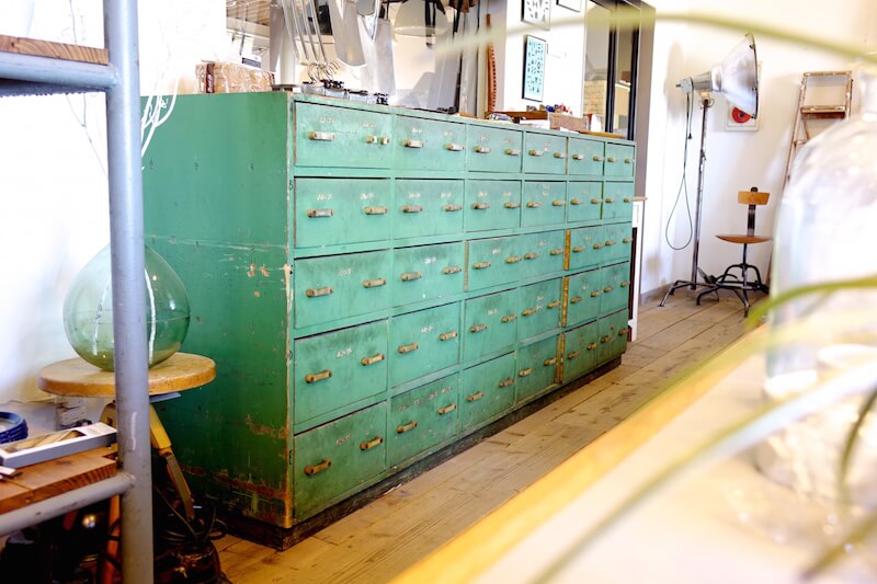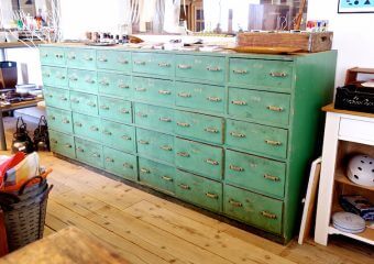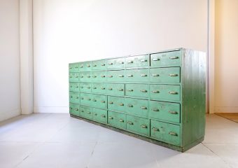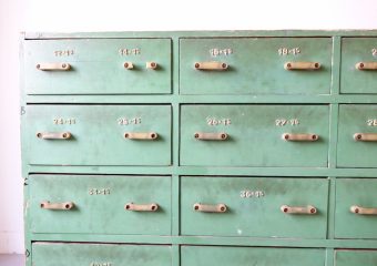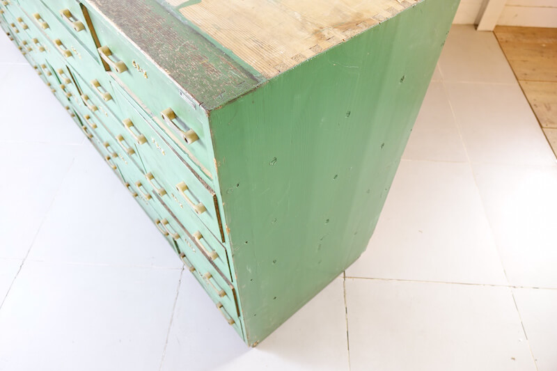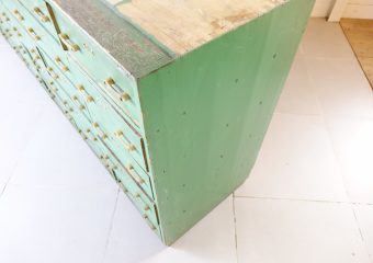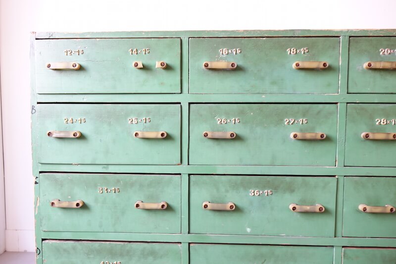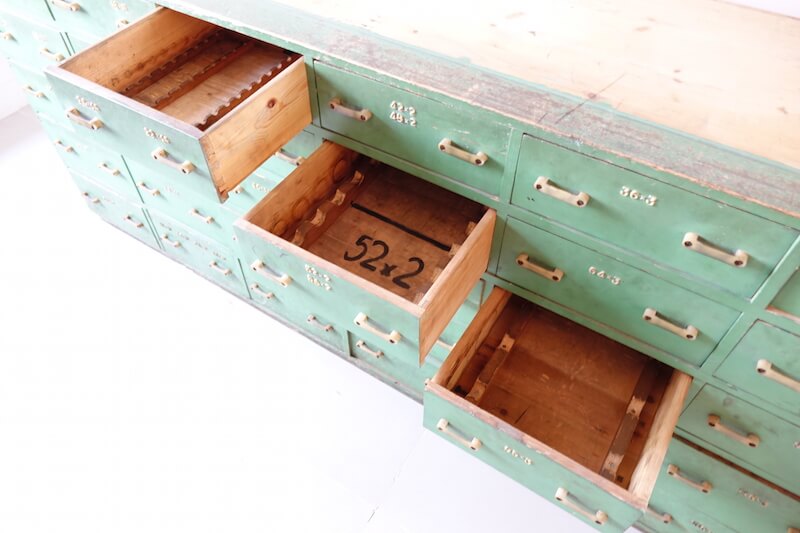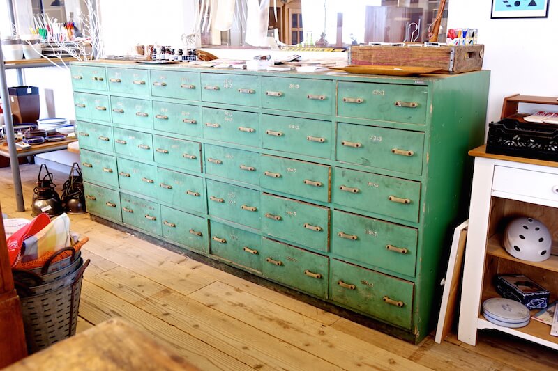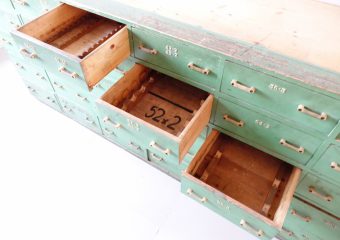 オランダのヴィンテージキャビネット。引き出しに付いたサインや取っ手が良い雰囲気を出してます。収納力抜群でショップカウンターや店舗什器として空間を印象付けてくれますね。