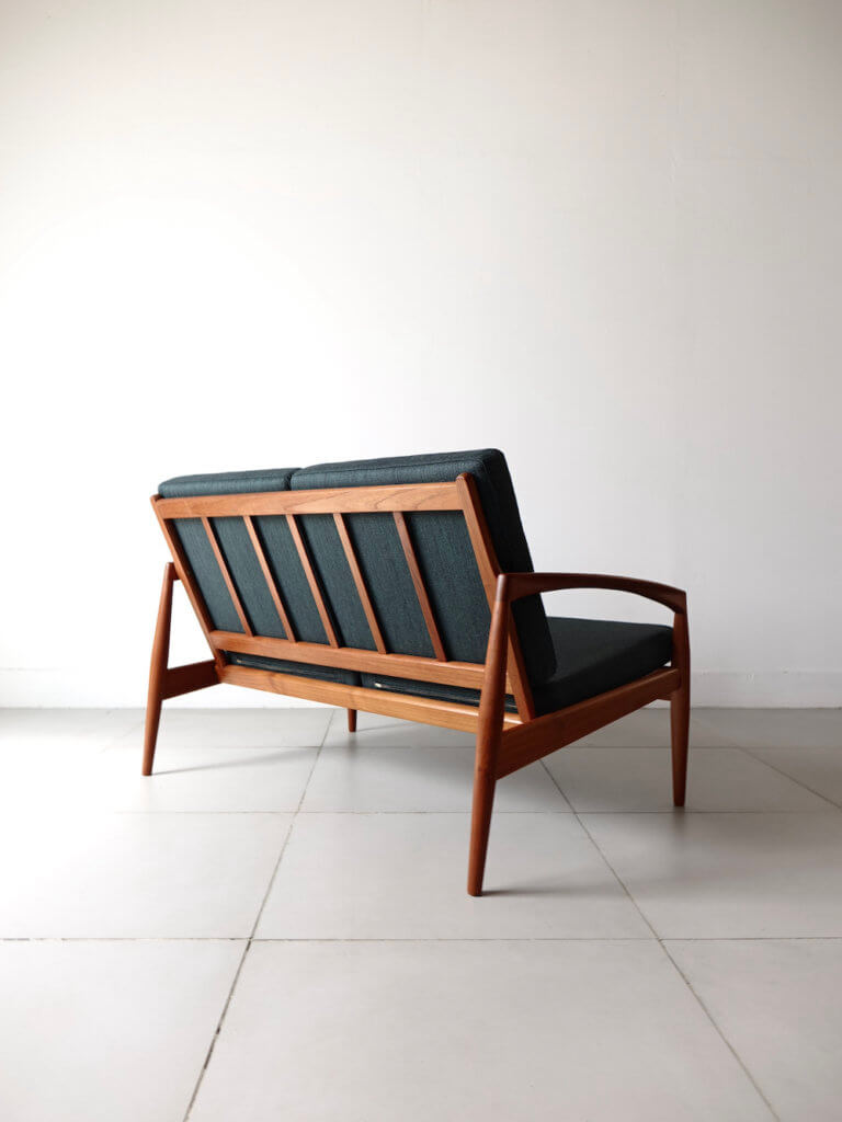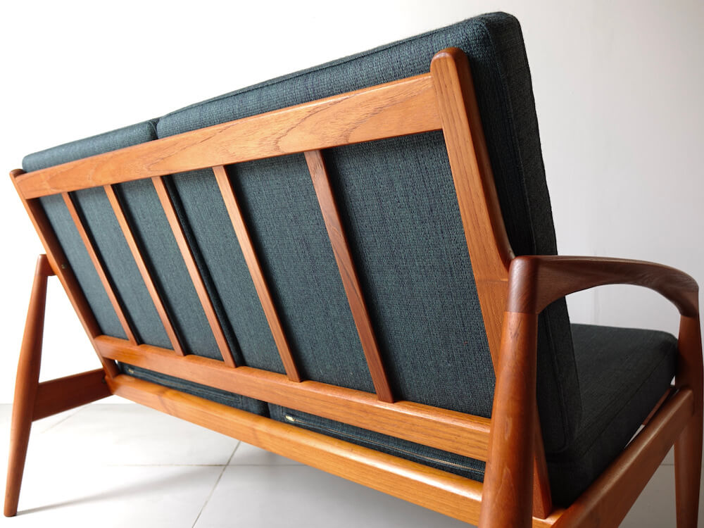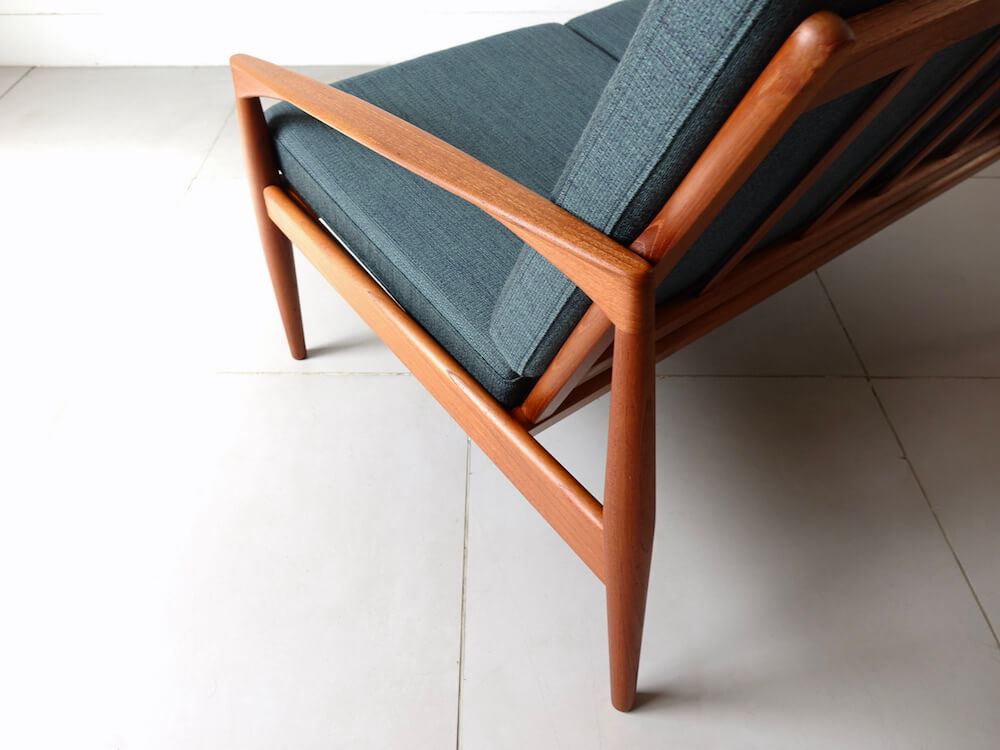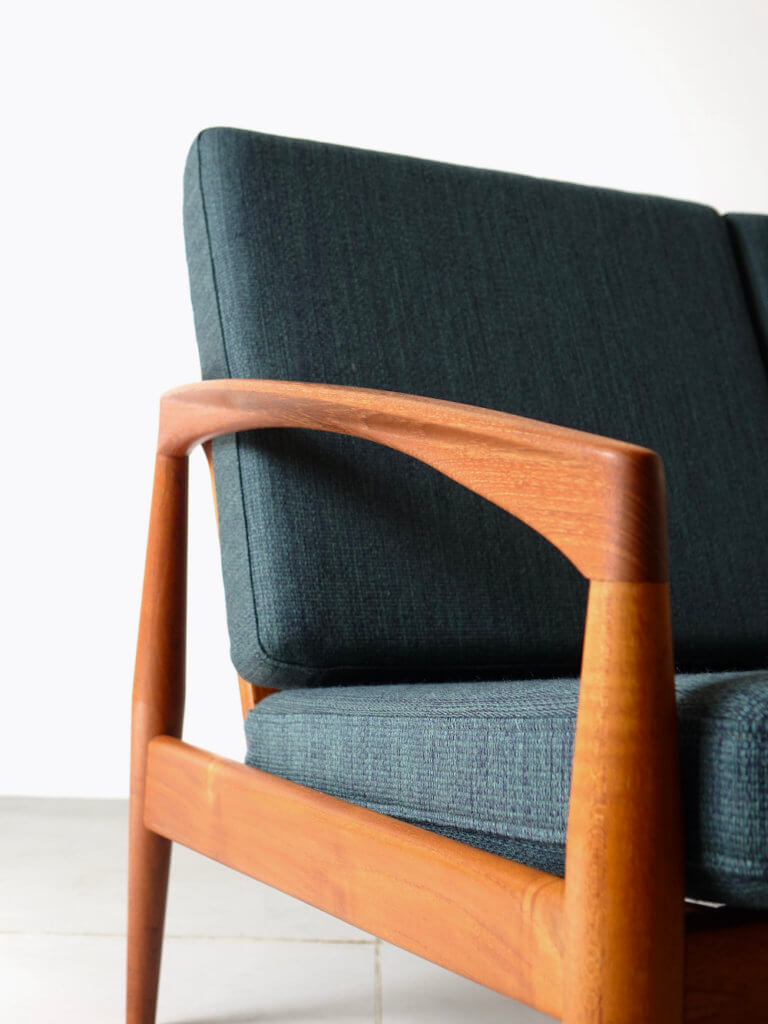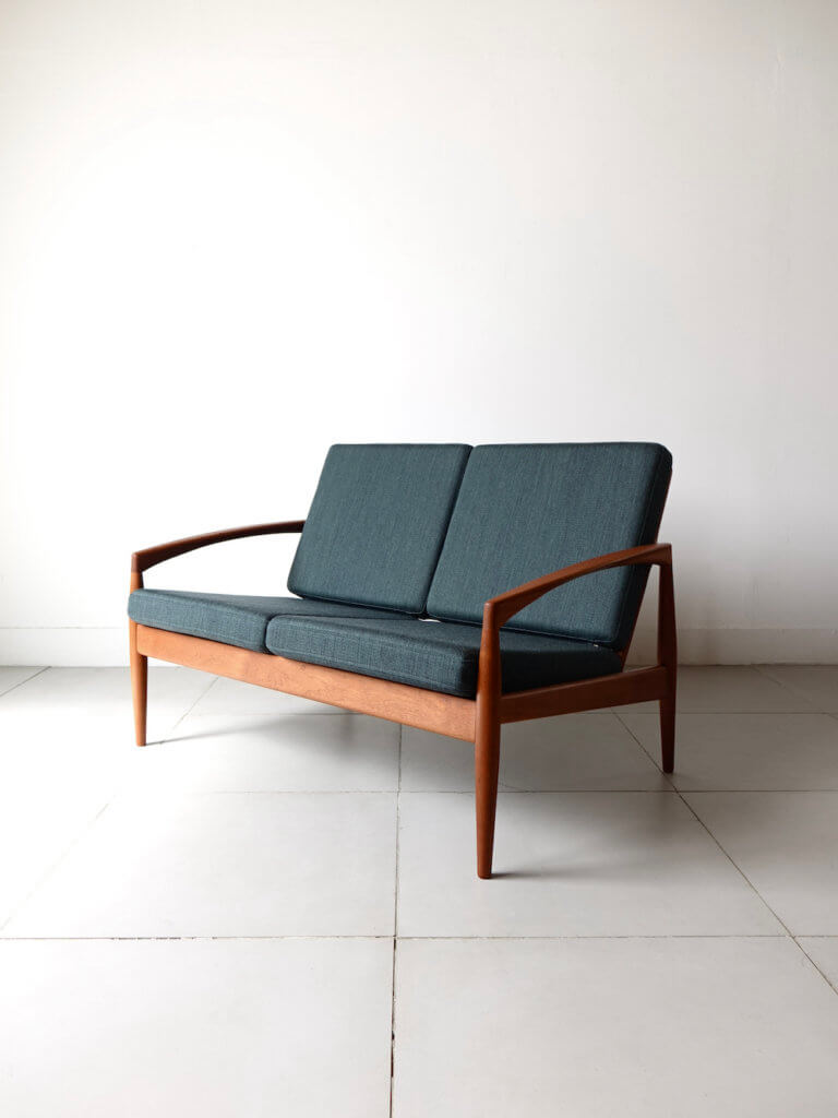 1956年、Kai Kristiansenr(カイ・クリスチャンセン)デザインにより最初期の発表を受け持ったMagnus Olesen社製の名作、通称ペーパーナイフチェアと呼ばれるソファシリーズの希少な2シーター”Model 122″。緩やかな曲線を描いたアームが特徴的で、その美しいフォルムからはモダンでありながらも温もりを感じる事が出来ます。やや後方に下がった座面 が安楽性を高めてくれる座り心地の良い逸品です。ファブリックにはデンマークの老舗メーカー「ケアロップ」社の緑色の生地を採用しミッドセンチュリーらしい佇まいを感じます。
