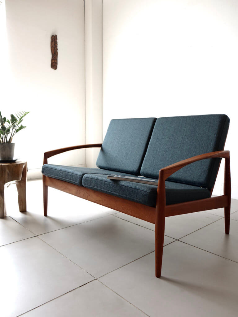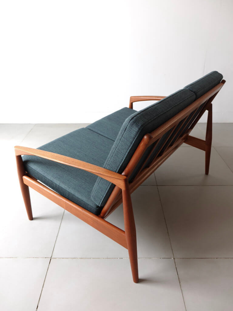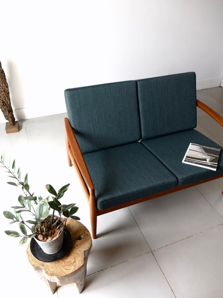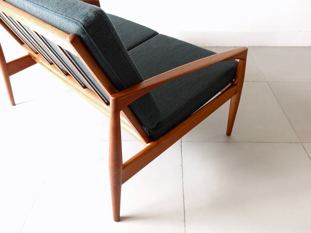 1956年、Kai Kristiansenr(カイ・クリスチャンセン)デザインにより最初期の発表を受け持ったMagnus Olesen社製の名作、通称ペーパーナイフチェアと呼ばれるソファシリーズの希少な2シーター”Model 122″。緩やかな曲線を描いたアームが特徴的で、その美しいフォルムからはモダンでありながらも温もりを感じる事が出来ます。やや後方に下がった座面 が安楽性を高めてくれる座り心地の良い逸品です。ファブリックにはデンマークの老舗メーカー「ケアロップ」社の緑色の生地を採用しミッドセンチュリーらしい佇まいを感じます。