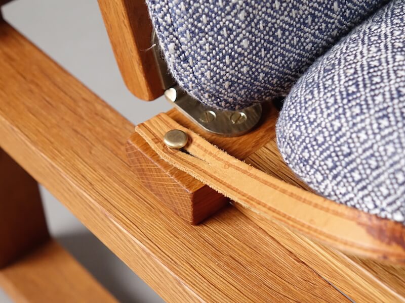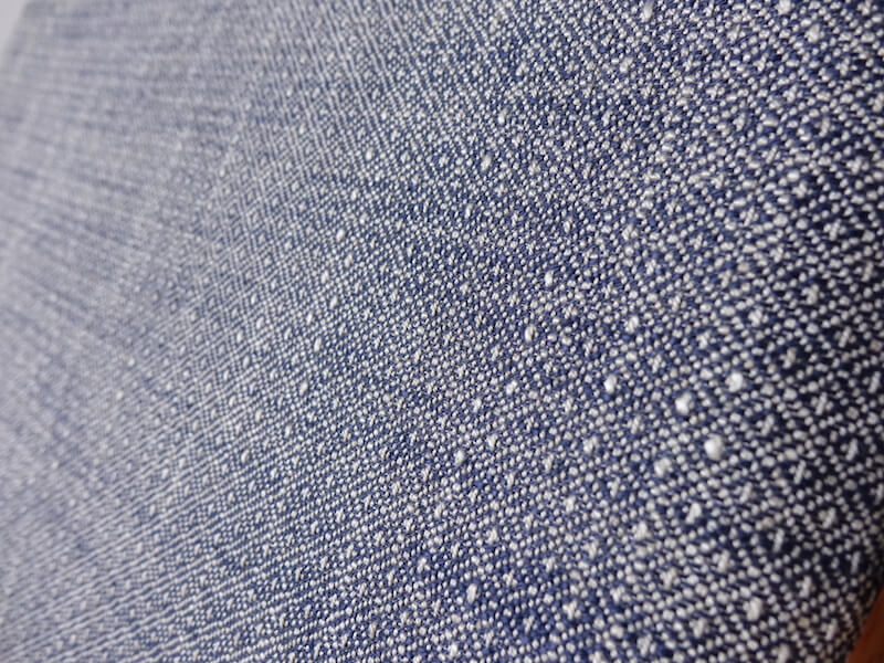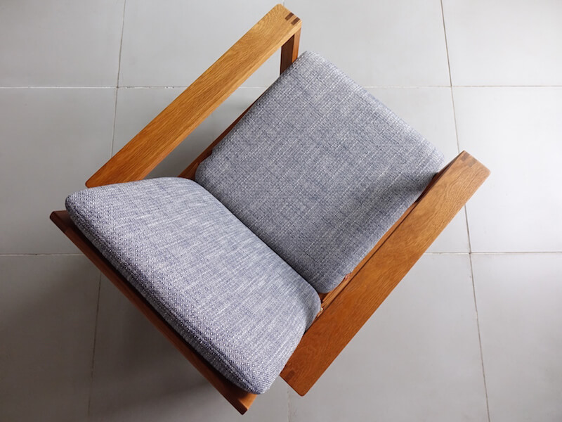 木部はフルサンディング、組み直し、再塗装を行い、ファブリックにはスペインの老舗ブランドGastón y Daniela(ガストン・ダニエラ)のあっさりとした幾何学模様のネイビーカラーを採用し、様々な空間に合わせ良い落ち着いた雰囲気に仕上がりました。内部ウレタン、下地材も新たに張り替えておりますので安心してご使用頂けます。