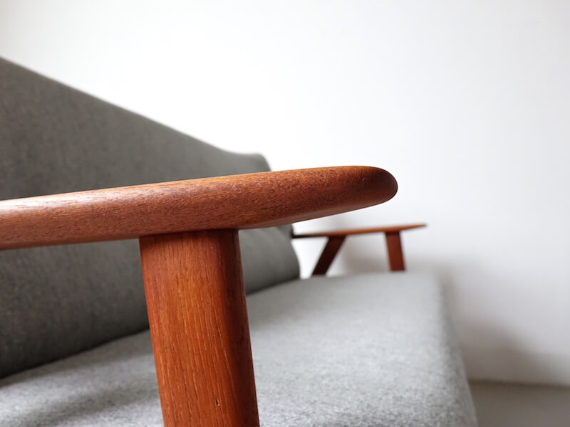 木部はフルサンディング、組み直し、再塗装を行い、ファブリックにはデンマーク老舗ブランドケアロップ社のグレー生地を採用、様々な空間に合わせ良い落ち着いた雰囲気に仕上がりました。内部ウレタン、下地材も新たに張り替えておりますので安心してご使用頂けます。