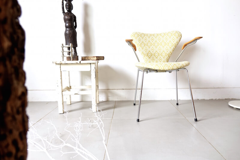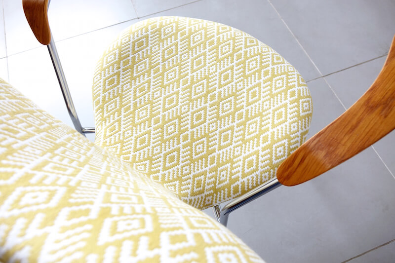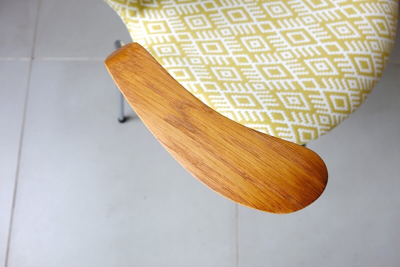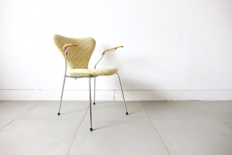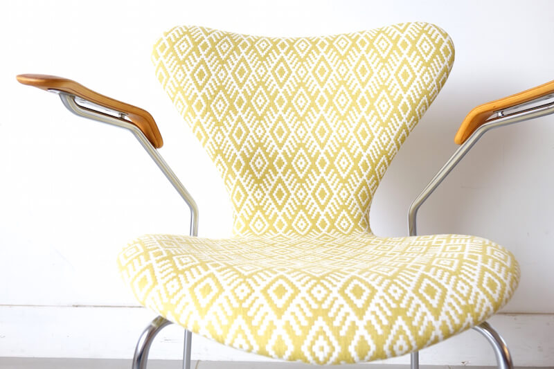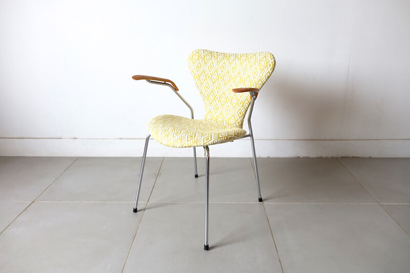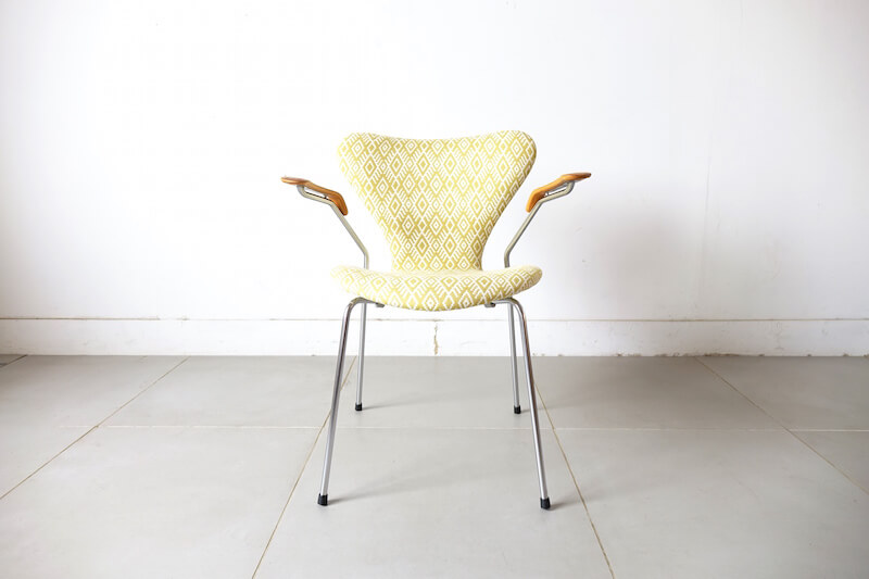 セブンチェア”model.3207″はデンマークの巨匠Arne Jacobsen(アルネ・ヤコブセン)が1955年にデザインし、デンマークを代表する家具ブランドFritz Hansenより発表されました。デンマーク家具のアイコンとしても、今尚絶大な人気を誇るセブンチェアのこちらは希少なアーム付きモデル。元々座り心地に定評のあるセブンチェアですがアームが付属することによりその安定感は一層増します。今回のファブリックはイギリスROMO社のSORAYAにて張替えました。SORAYAは伝統的な民族柄のような大胆な幾何学模様をジャガード織で表現され、柔らかなレーヨンリネンで手触り良く経年変化したオークアームと金属脚に美しくマッチし、一点物としての他には無い特別な逸品に仕上がりました。