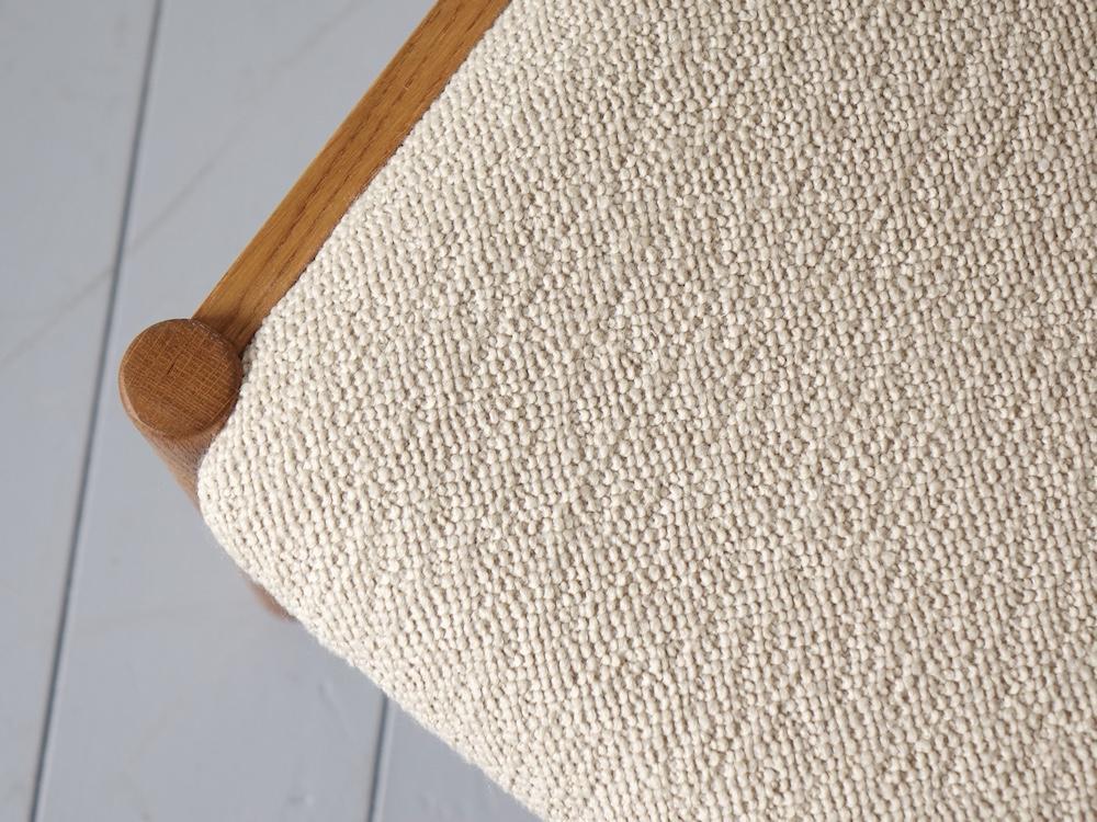 張地には、Les Créations de la MaisonのPERCY col. 3を採用。ウールとビスコースのブークレ糸による、やわらかく表情豊かな質感が特徴で、オークフレームと調和する落ち着いたベージュカラーが、上品な印象に仕上げています。