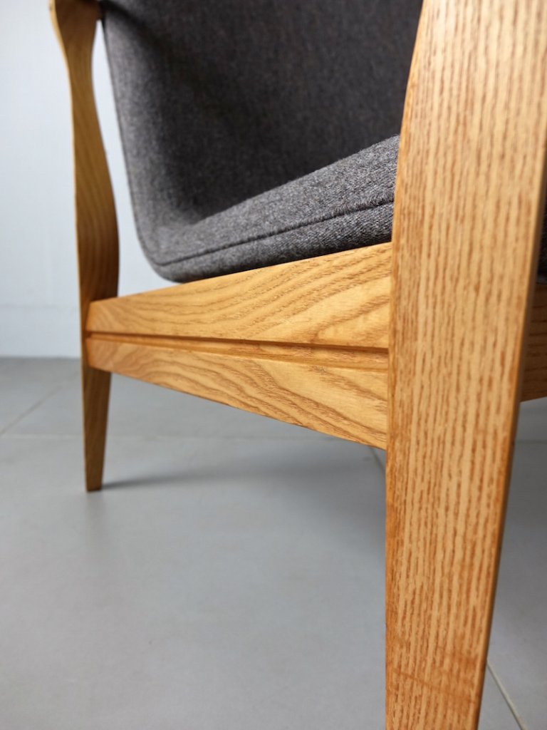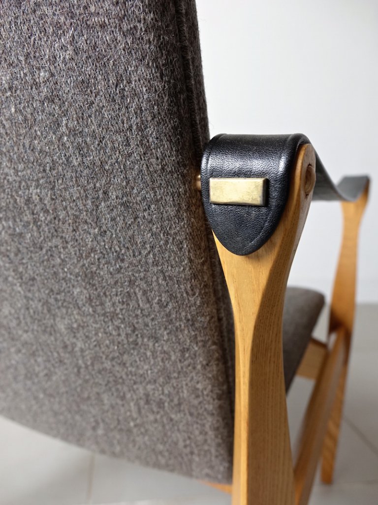 個性的で美しく削り出されたアッシュ材のフレームに革のアームレスト。それに搭載された一体化した背もたれと座面は体を包み込むような座り心地で、ミッドセンチュリーの醍醐味を感じさせてくれる希少な椅子です。ファブリックには老舗ブランドケアロップのグレーを採用し空間のテイストを選ばない落ち着いた雰囲気に仕上がりました。アームレストや背もたれとフレームを繋ぐ金具に使われた真鍮が美しいアクセントになっているのもポイントです。