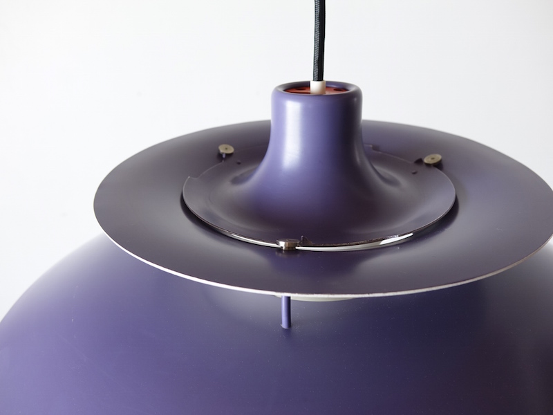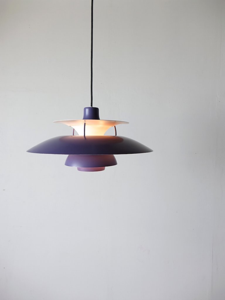 北欧の灯りとして世界的に最も認知されている照明のひとつであり、1958年発表から現在も生産が続けられているルイスポールセンのベストセラーPH5、ヴィンテージならではの希少なパープルカラーです。デザイナーPoul Henningsen(ポール・ヘニングセン)の頭文字をとった同シリーズのアイコンは形状の異なる5枚のシェードを絶妙に組み合わせたことで、どの角度から見ても光源による眩しさが無く、そのシェードから反射する光のグラデーションは優しく柔らかく空間を照らしてくれます。光を灯していない日中でもそのユニークな外観はモダンで美しく、デザインから半世紀を過ぎた今でも愛され続ける魅力をきっと感じて頂けます。(ソケットは引っ掛けシーリングタイプで対応電球はLEDを含むE26口金サイズです。)