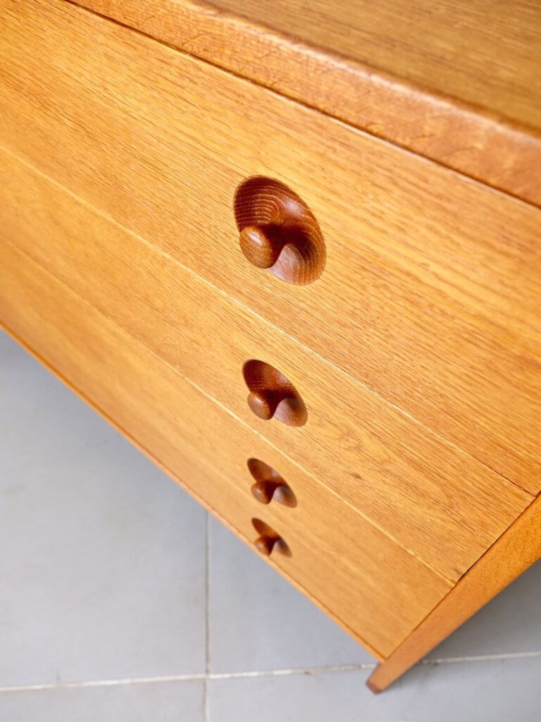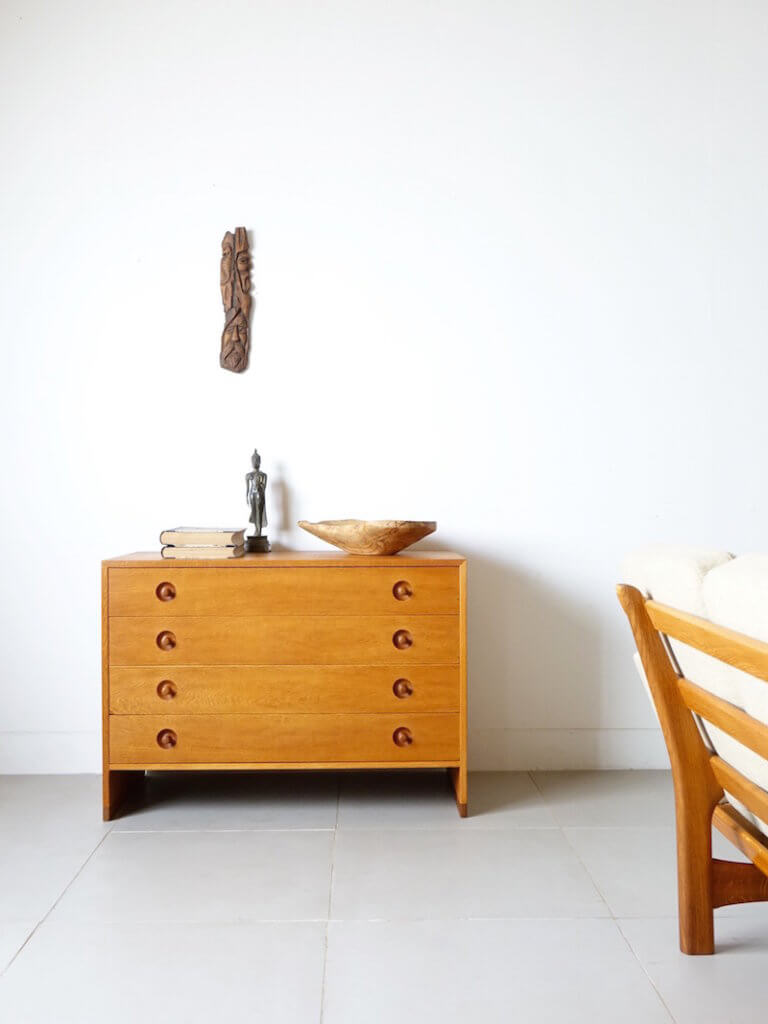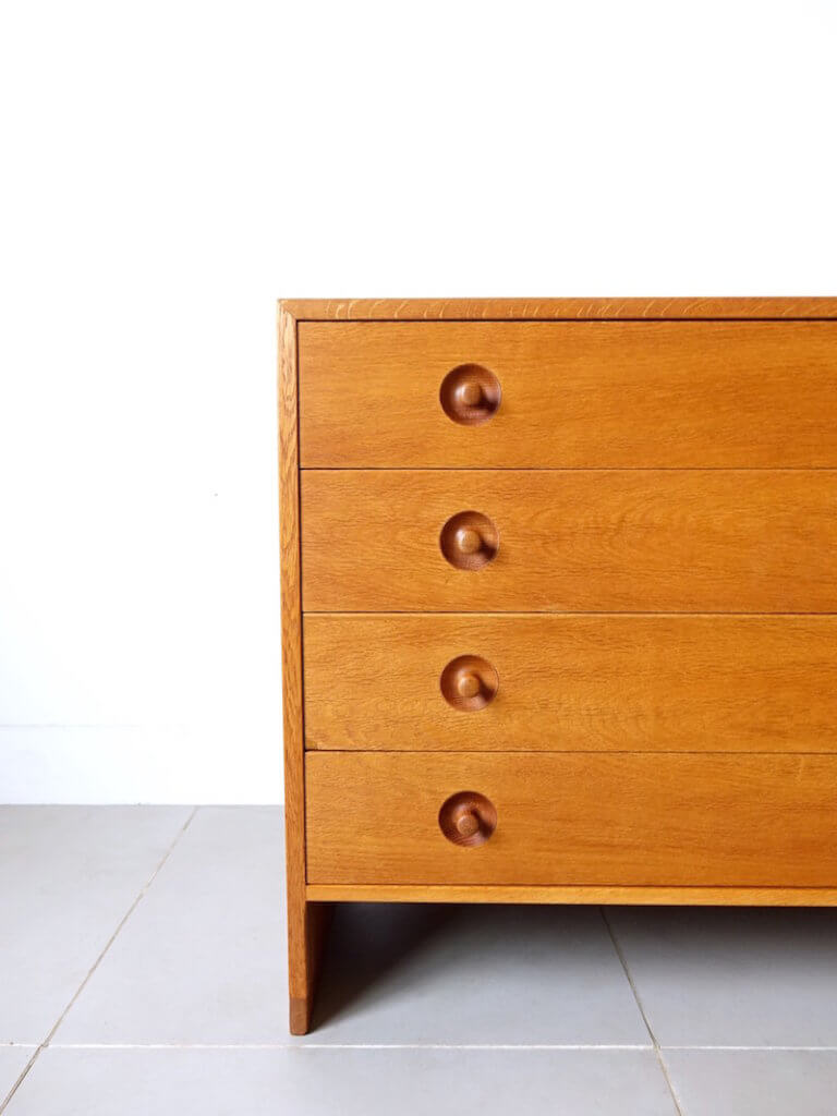1950年代にHans J. Wegner(ハンス J ウェグナー)がデザインし、彼のキャビネット類を数多く手がけたRY Mobler社より発表されたシリーズのヴィンテージチェスト。たっぷりと収納頂ける4杯の引き出しに付いた、特徴的な手掛かりが良い取っ手がスムーズな引き出しの開閉を実現し、下部を抜くことで圧迫感を無くしすっきりとしたデザインに。その佇まいは巨匠ウェグナーの細部まで機能性を調和させた拘りを感じて頂けます。生産から半世紀を過ぎた今も全く古さを感じさせないこのモダンなデザインは、更に数十年後も同じように大切に受け継がれていくのでしょう。