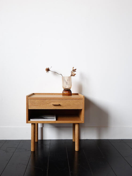 Hans J. Wegner(ハンス・ウェグナー)がデザインしたRY Mobler社製の名作ヴィンテージスモールチェスト”RY430″。シンプルで小振りなデザインは、持ち運びし易く、ベッド、ソファーサイド、リビングやエントランスなど置く場所を選びません。小さな引き出しにはRY社のシリーズ特有の取っ手が付き、内部にはオーク無垢材が使用されているなど、シンプルな外観と細部まで妥協のないしっかりとしたデザインは、使い勝手とインテリアとの調和に反映され、生産から数十年が経った今でもヴィンテージとして愛され続けるウェグナーデザインの証を感じ取れる美しい逸品です。