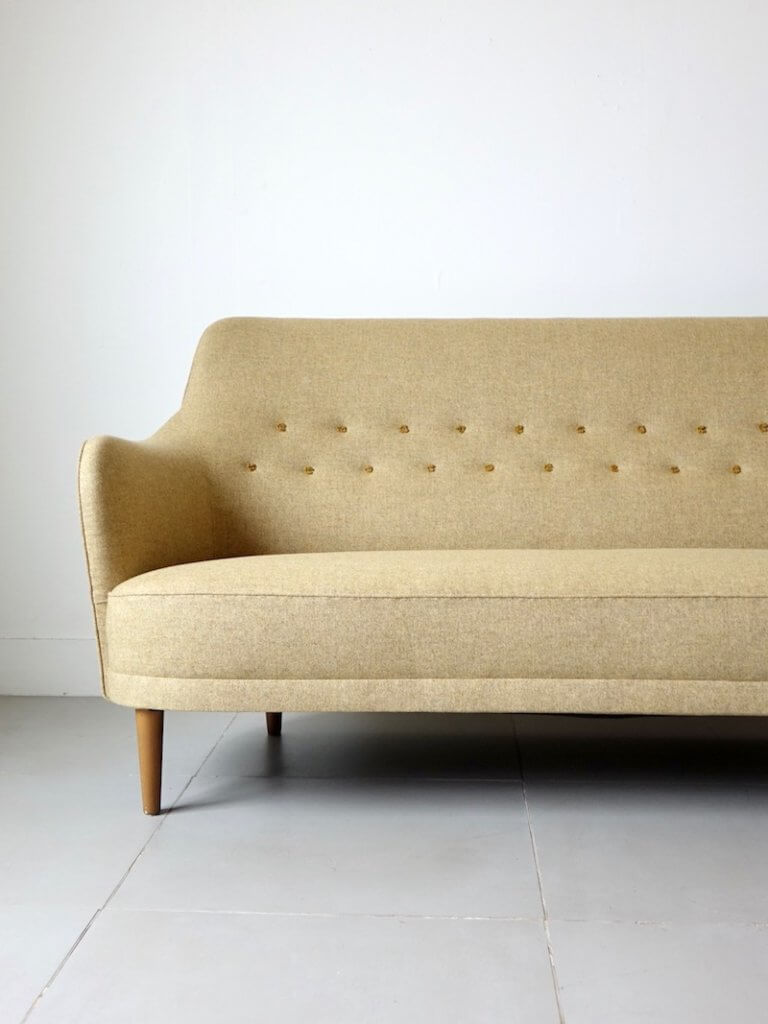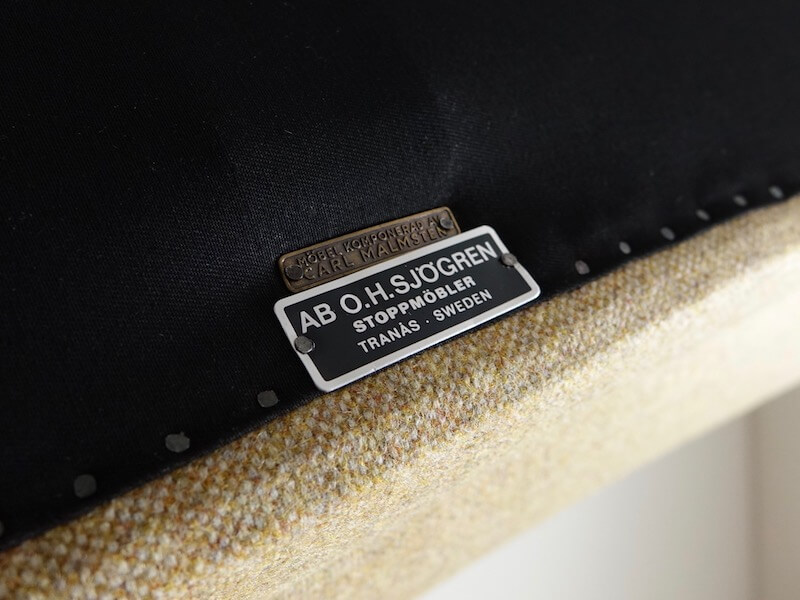 1923年にスウェーデン家具の父とも言われる巨匠Carl Malmsten(カール・マルムステン)がコンサートホール用のアームチェアをデザインしたことから始まったO.H. Sjögren Tranåsのシリーズ代表作のソファ”Samsas”。曲線に対する作家独自の世界観が随所に現れ、エレガントで美しい佇まいと共にその湾曲したフォルムはどの角度から体を預けても優しく受け止めてくれる機能性を持ちます。座面の傾斜は浅くほぼフラットな為、立ち座りがしやすく、独特な肘掛の形状は自然と腕をおろしたくなるような納まりの良さがございます。ファブリックはデンマークの老舗デニッシュアートウィーヴィングのマッシュルームカラーにて張り替え、落ち着いた印象とともにウール100%の優しい肌触りがより一層の安楽性とインテリアの雰囲気を引き立ててくれます。