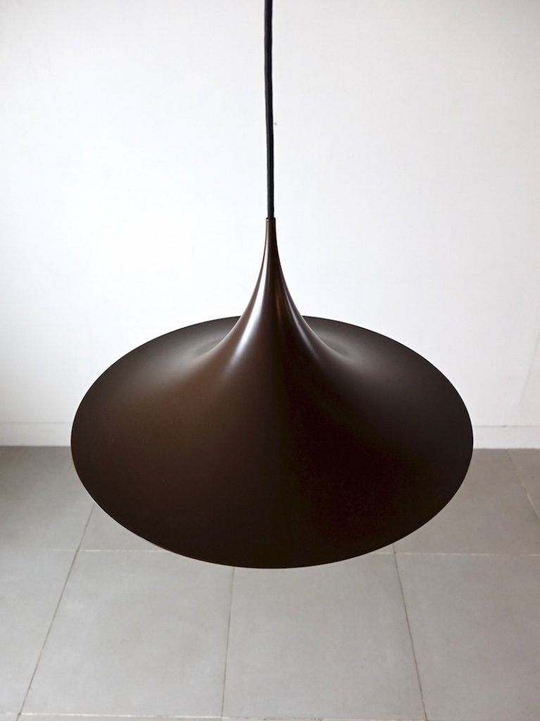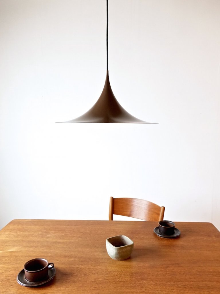 1967年、Claus BonderupとTorsten Thorupによるデザインで発表されたFog&Morup(フォグ&モーラップ)社製ペンダントランプ『SEMI』シリーズ。高度な技術で成形されたシンプルでユニークなフォルムが特徴的な、現在では大変希少なペンダントランプです。(引っ掛けシーリングタイプ、対応電球はLEDを含むE26口金サイズ。)