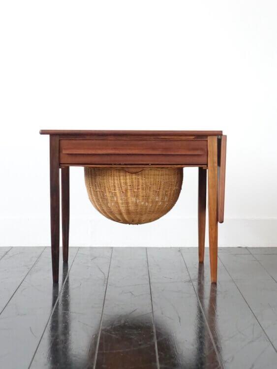 引出し内部は細かく裁縫道具を収納出来る中段と、下段は布や毛糸などの収納を目的とした深めの引き出しボックス。天板はスライド式で31cm拡張出来、用途に合わせた作業を考慮した機能性を持ちます。裁縫用の道具としてだけでなく日用品の収納するキャビネットテーブルとしても現代の生活にもフィットする機能的なデザインです。素材は貴重なローズウッド材が使用され非常にコンディションも良く優美で非常に存在感のある佇まいです。