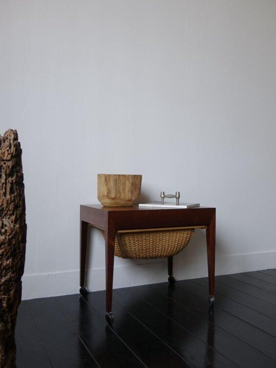 1960年代にSeverin Hansen Jr.(セヴェリン・ハンセン Jr.)によってデザインされ、現存するデンマークの老舗ブランドHaslevより発表された希少なローズウッド材を使用したヴィンテージソーイングテーブル。使い手の融通を考慮したとてもユニークなデザインで、引き出しを横へスライドさせると細かく仕切られた針山付きの小物入れ。籐編みのバスケットは両サイドから引き出すことができ、大きくたっぷりと収納ができます。細部にわたり丁寧に作られた質の高さと、当時の裁縫道具としての用途以外にもサイドテーブルやコーヒーテーブルとしても良いサイズ感で、多様性のある北欧家具らしいヴィンテージソーイングテーブルです。