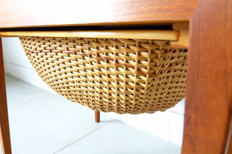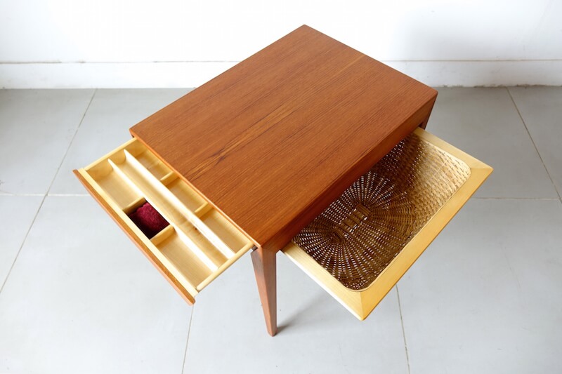 1960年代にSeverin Hansen Jr.(セヴェリン・ハンセン Jr.)によってデザインされ、現存するデンマークの老舗ブランドHaslevより発表されたヴィンテージソーイングテーブル。使い手の融通を考慮したとてもユニークなデザインで、引き出しを横へスライドさせると細かく仕切られた針山付きの小物入れ。籐編みのバスケットは両サイドから引き出すことができ、大きくたっぷりと収納ができます。細部にわたり丁寧に作られた質の高さが伝わり、当時の裁縫道具としての用途以外にもサイドテーブルやコーヒーテーブルと多様性のある北欧家具らしい上質なテーブルです。