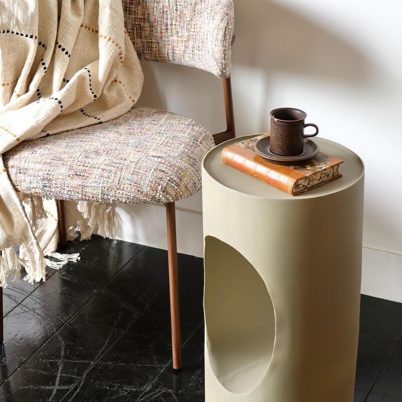 ユニークな楕円形と中央のカットアウトデザインが特徴的な、パウダーコーティングのアイアン製サイドテーブルです。高さ56cm、直径30cmのこのサイドテーブルは、お気に入りのインテリアを飾ったり、ソファ横でリモコンやコーヒーカップを置いたりするのに最適で使いやすいサイズ。耐久性も抜群なので、さまざまなシーンで長く愛用いただけます。