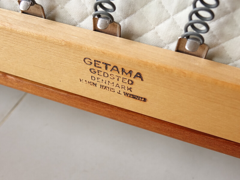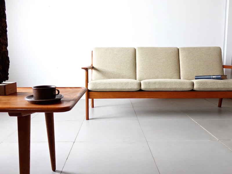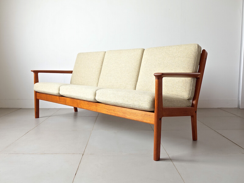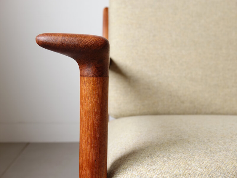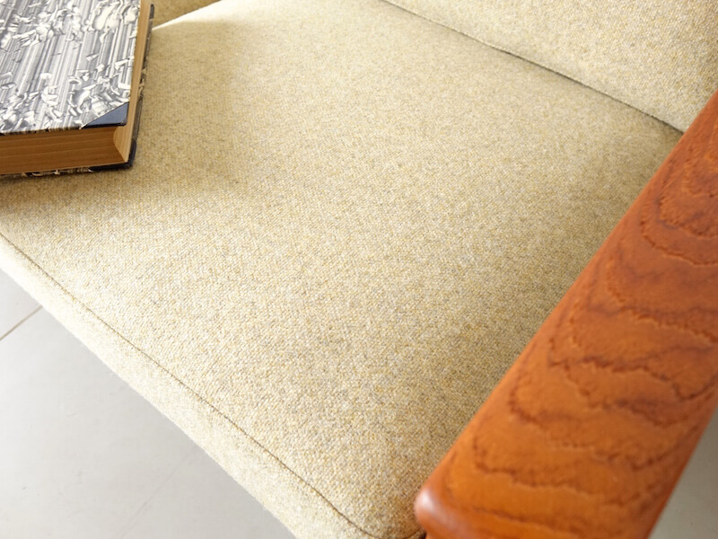 1978年、北欧家具デザインの巨匠Hans J. Wegner(ハンス・ウェグナー)がGETAMA社より発表したヴィンテージ3シーターソファ”GE265″。同社の名作GE290やGE370に比べると背もたれの角度や座面の傾斜が浅く、座高も42cmと立ち座りの際の負担が考慮されたデザインであることが伺えます。クッションはゲタマ社特有のスプリングタイプで適度に弾力のあるクオリティの高い座り心地を体感することが出来ます。ファブリックはデンマークのデニッシュアートウィーヴィングWales 36を採用。ベージュをベースカラーとした落ち着きのある色合いとウール100%の柔らかい質感は経年変化した美しいチーク材とマッチし柔らかい印象に仕上がっています。