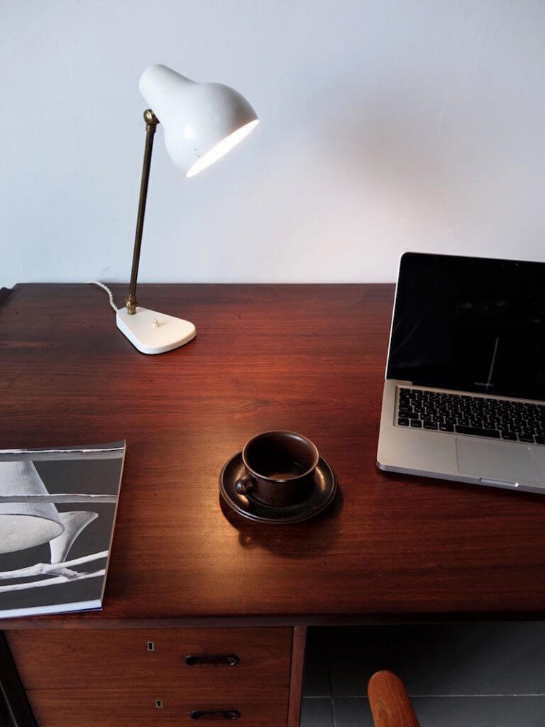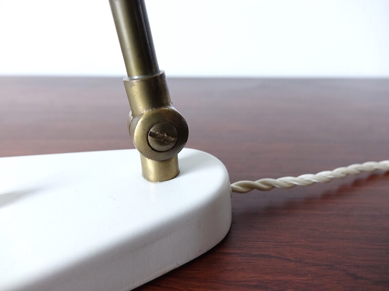 デンマークの歴史の中でも最も有名な建築家の1人である、デンマーク機能主義建築の先駆者Vilhelm Lauritzen (ヴィルヘルム・ラウリッツェン)。ラウリッツェン建築事務所にはあのフィン・ユールも在籍していたことはよく知られております。このヴィンテージ“VL38″テーブルランプは1930年代後半、コペンハーゲンにあるデンマーク国営放送局(ラジオハウス)の建物 (現在はデンマーク王立音楽アカデミーが使用) のために、ラウリッツェンが老舗照明メーカーLouis Poulsen(ルイスポールセン)と共同で製作されたシリーズの一つです。経年変化した真鍮のアームに付いたペア・シェイプ(梨型)と呼ばれるの美しく有機的なフォルムが特徴的で、シェードとアームは上下に可動し、光の向きを調整することが出来る機能性。昨今のヴィンテージ市場ではほとんど見かけることのない大変希少で美しいヴィンテージランプです。