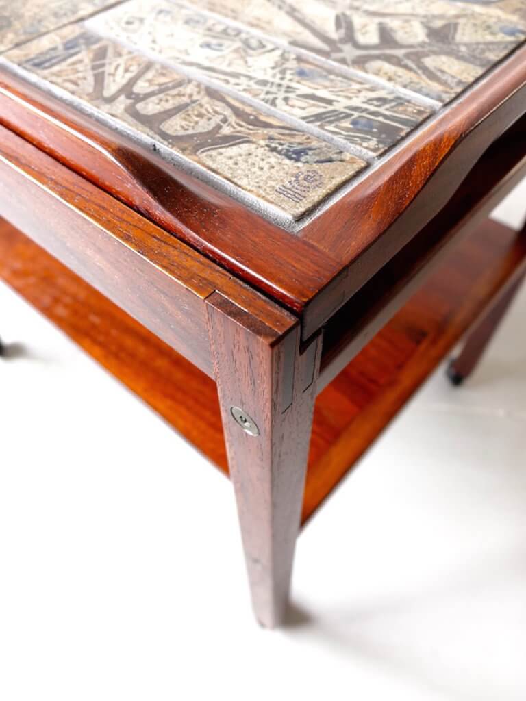 1960年代を中心に、数多くのテーブル類を発表したデンマークの家具メーカー、Haslev社によって作られたティートローリーです。小ぶりなサイズでダイニング以外にソファサイドやベッドサイドでもご使用頂けます。トップにはロイヤルコペンハーゲン窯で焼成された、ニルス・トーソンによるデザインの”BACA”シリーズのタイルが嵌め込まれ、天板ごとサービストレーとなるユニークな構造です。トレーの底面全体にフェルトが張られ、そのままテーブルの上などに載せても傷が付き難いように工夫されたデザインです。