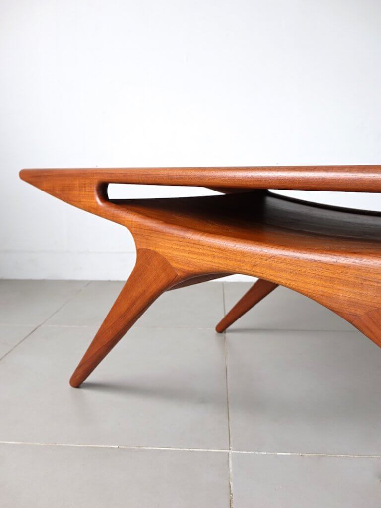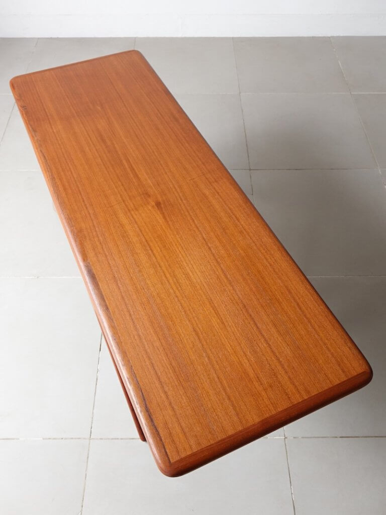 1957年にJohannes Andersen(ヨハネス・アンダーセン)がデザインしたC.F.Christensen社の名作コーヒーテーブル 。独創的なフォルムからUFOテーブルやスマイルテーブルと呼ばれています。天板と収納部が一体化した画期的なアイデアによりデザイン性と機能性が見事に 融合した名作家具のひとつです。昨今市場でもなかなか見かけることの無い希少な作品となります。木部はフルサンディング、組み直し、再塗装を行っておりますので安心してご使用頂けます。