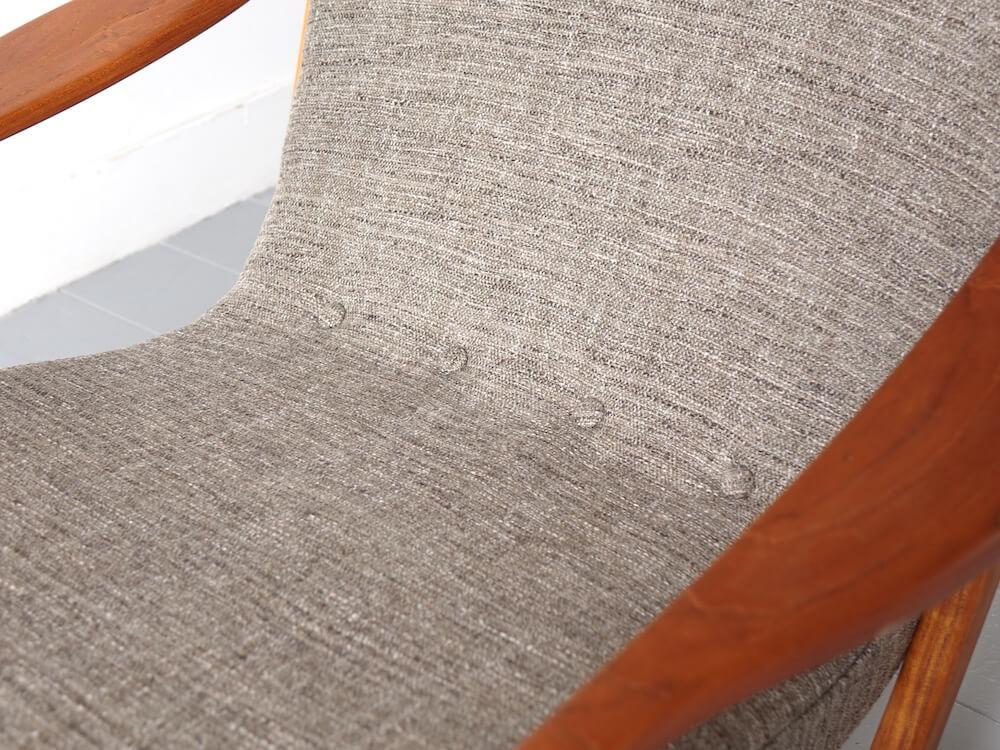ゆったりとしたハイバックの背もたれは身体をしっかりと支え、読書やリラックスタイムに最適な座り心地です。フレームにはチーク材を使用。温かみのある木目と滑らかな曲線が特徴で、ミッドセンチュリー期の北欧家具を思わせる上品なデザインです。