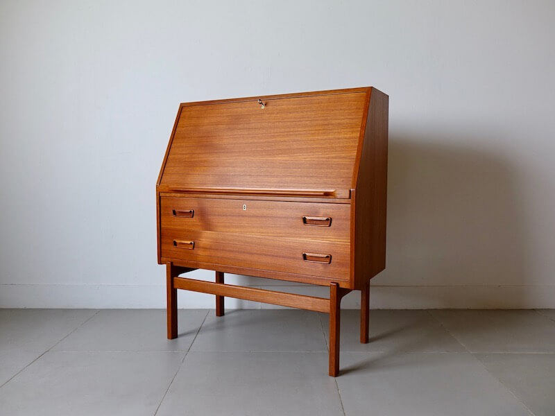 1960年代のArne Wahl IversenデザインによるVinde Møbelfabrik製の珍しいライティングビューロ。コンパクトでシンプルな佇まいは経年変化した良質なチーク材を一層際立たせてくれています。中央部の取っ手を手前に引き出すとちょっとした作業スペースが現れ、その状態からメインの扉を倒すことで天板が平行に固定されます。扉内は、本やPCなどを置ける広く取られたスペースと小物を分けられるスペース。美しい比率で削り出された無垢材の小引き出しはとてもユニークで、その機能性と調和した美しいデザインは開ける度に心を擽ります。下部には鍵付きの引き出し、底板は新規に交換しておりますので安心して収納頂けます。
