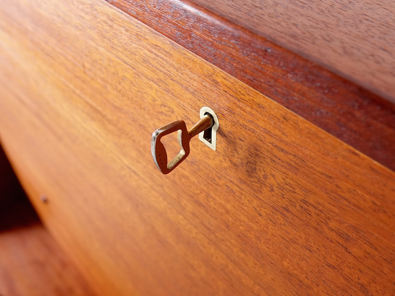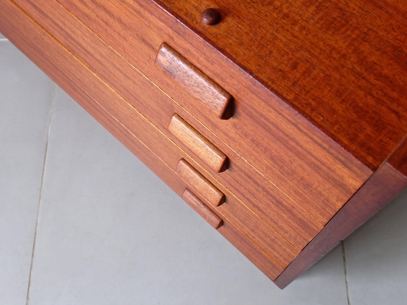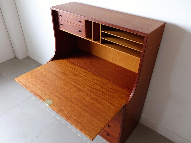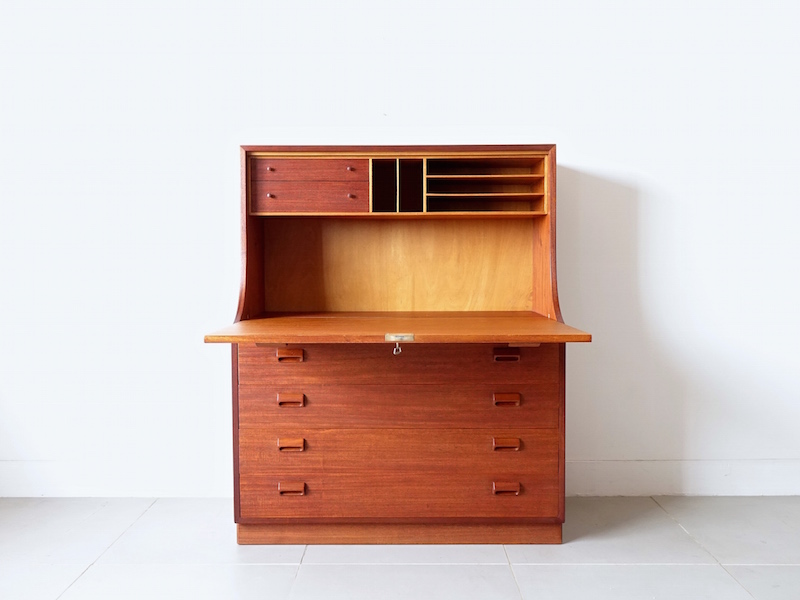北欧家具デザインの巨匠Borge Mogensen(ボーエ モーエンセン)デザインにより1959年に発表されたSøborg Møbler社製ヴィンテージライティングビューロ”Model.143″。1950年代から1960年代にかけて、Søborg Møblerはデンマークの家具デザイナーと共同で家具の実験、製造、展示を行いました。その中心にいたモーエンセンはファッションや高価な素材の気まぐれな流行には決して耳を傾けず、代わりに強力でシンプルなラインと、実用性の具現化へ試作を繰り返したそうです。そんなモーエンセンの洗練された機能性から生まれたデザインは半世紀が過ぎた今でも決して色褪せることのない日常使いへの拘りが凝縮されています。ホームオフィス、勉強机、コンパクトなユニット収納としてなど今も美しい収納家具としての輝きを放ちます。